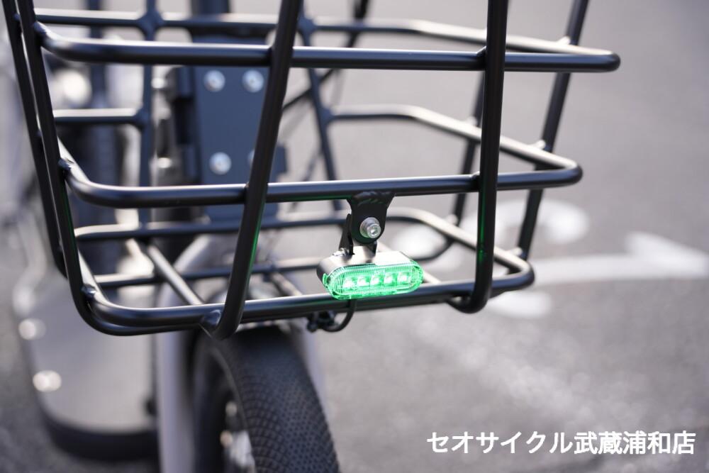 フロントバスケットの下に配置されている緑色のLED(画像参照)が、特定小型原付の証です。