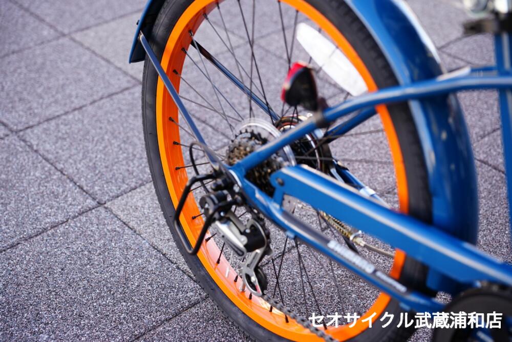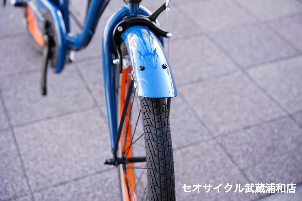深みのあるネイビーに、元気いっぱいのオレンジがアクセント。ブラウンのグリップとサドルが大人っぽさを演出する、都会的でクラシックな一台。